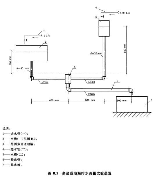 3多通道地漏排水流量試驗裝置見附錄B圖B.3。打開進水閥,向水槽1和水槽2分別注入(1士0.2)L/s和(0.25士0.05)L/s,保持地漏面不冒水,調節進水流量,維持60 s,此時兩個進水流量之和即為地漏排水流量。測兩次,以兩次平均值作為測試結果。