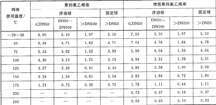 - 球閥閥座和密封件材料使用聚四氟乙烯或增強聚四氟乙烯時,球閥閥座和密封件材料的允許工作壓力——溫度額定值按照下表的規定: