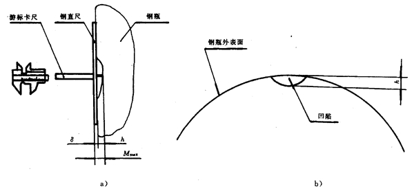 以凹陷的弦為基準測量深度,量具為高度游標卡尺或直尺,直尺應沿氣瓶軸線放置,直尺長度應大于凹陷直徑的三倍,如圖B1a)所示。