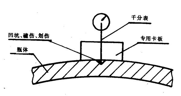 a)凹坑、磕傷、劃傷深度值以深處為準,測量用的專用量具如圖B2所示。卡板的型面曲率半徑與鋼瓶外廓相吻合,千分表的針尖插入缺陷中測量其深度,針尖的楔角應小于等于30°,半徑應小于等于0.25mm。測量過程中要定期校核千分表的讀數,以消除由于針尖磨損造成的誤差。
